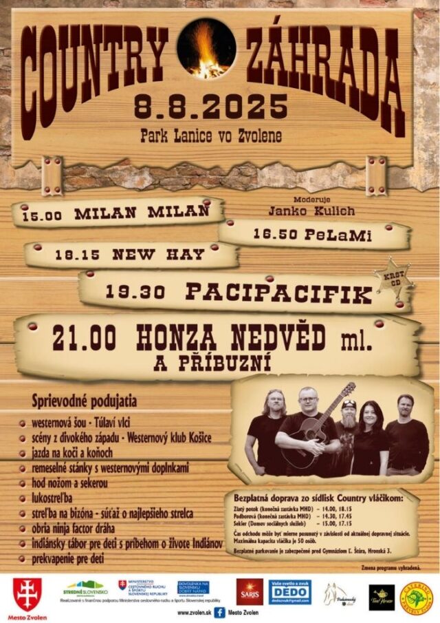 Hudobným ťahákom festivalu bude Honza Nedvěd ml. s kapelou Příbuzní, ktorý do Zvolena prinesie legendárny český folk s novou energiou. Na pódiu sa počas popoludnia a večera predstavia aj známe slovenské country a folk formácie Pacipacifik, New Hay, PeLaMi a Milan Milan.