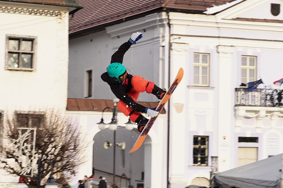 FOTO: Na námestí v Kremnici lietali jazdci na lyžiach a snowboardoch poriadne vysoko