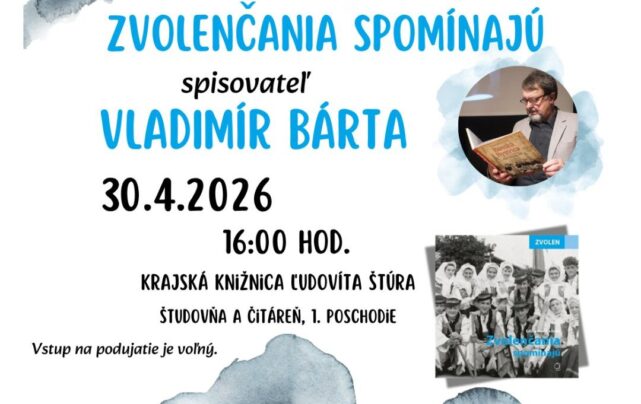 Vydavateľ publikácie OZ Chráňme dedičstvo predkov vás v spolupráci s Krajskou knižnicou Ľudovíta Štúra pozýva na slávnostné uvedenie novej knihy do života, Zvolenčania spomínajú. Podujatie prebehne za účasti autora, spisovateľa Vladimíra Bártu. Uskutoční sa v priestoroch študovne knižnice na 1. poschodí. Podujatie ponúka príležitosť stretnúť autora, vypočuť si zaujímavé rozprávanie o vzniku publikácie a spoločne si pripomenúť spomienky na Zvolen a jeho obyvateľov. Vstup je voľný.