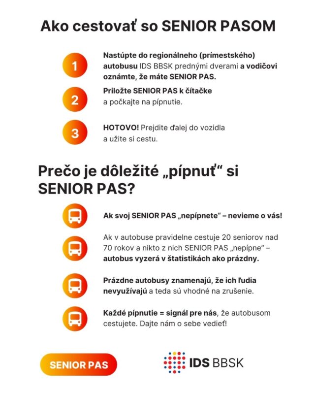 Doterajšie preukazovanie občianskym preukazom a tlač nulových registračných lístkov sa tak stane minulosťou. Seniori, ktorí si SENIOR PAS nevybavia, budú mať od nového roka nárok už len na 50 % zľavu z cestovného. „Vyhoveli sme požiadavkám vodičov i samotných seniorov a prišli s novým produktom – SENIOR PASOM. Bude fungovať podobne ako predplatné lístky a seniori nad 70 rokov vďaka nemu budú cestovať regionálnymi autobusmi po celom kraji úplne zadarmo, na jednoduché pípnutie,“ vysvetlil predseda BBSK Ondrej Lunter.